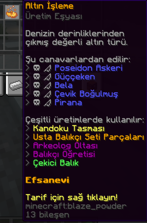 - Altın İşleme, oyun içerisinde çeşitli Deniz yaratıklarını alt ettiğinizde düşebilen Efsanevi sınıfı bir üretim eşyasıdır.