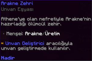 Arakne Zehri, Arakne alt ettiğiniz zaman düşük bir şansla elde edilen Nadir sınıfı Üretim ve Unvan eşyasıdır.