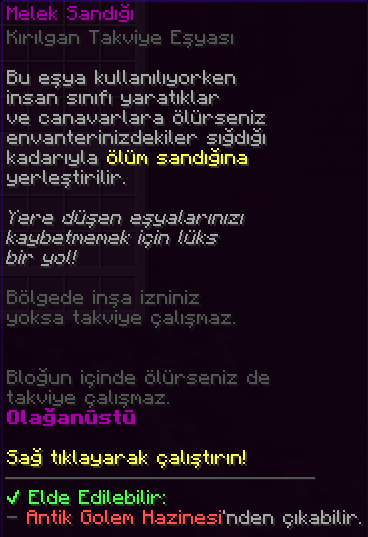 - Bu takviye eşyası takılıyken, bir insan sınıfı yaratık veya canavar tarafından öldürülmeniz durumunda, öldüğünüz konumda inşa izniniz bulunuyorsa, envanterinizdeki eşyalar sığdığı kadarıyla bir ölüm sandığına eklenir. Sandığa sığmayan eşyalar ise olduğu yere düşer.