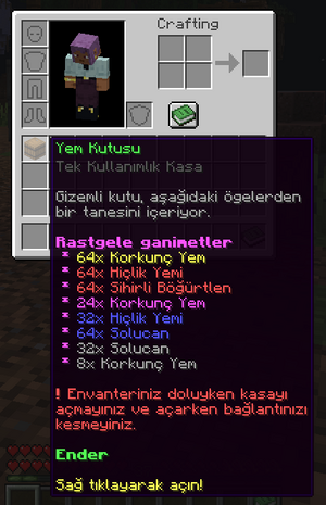 < | '''<span style="color:#9b59b6">Yem Kutusu</span>''', '''[[Yem Kesesi]]''' içine eklenebilecek yemlerden birini içeren özel bir sandıktır. | ||