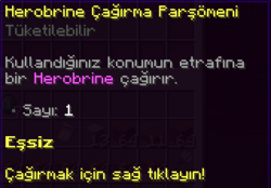 Herobrine Çağırma Parşömeni, kullanıldığı zaman oyuncunun bulunduğu konumun yakınına 1 adet Herobrine çağıran özel bir eşyadır.