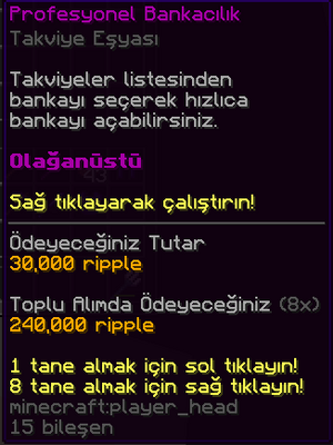 💰 Profesyonel Bankacılık Profesyonel Bankacılık, Satıcı'da satılan bir takviye eşyasıdır. 30,000 Ripple karşılığında Satıcıdan satın alabilirsiniz. Bu takviye eşyası, sizin Hayatta Kalma Kitabı'nıza bankacılık bölümünü ekler. Bankanızı bu bölümde kolaylıkla yönetebilirsiniz. Nadirliği: Olağanüstü